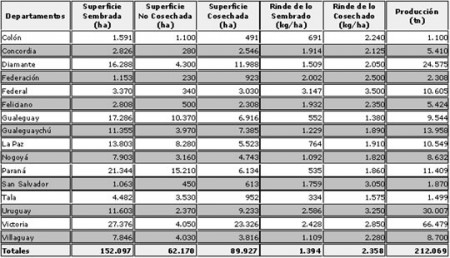 Los productores entrerrianos sembraron 152.097 ha y lograron producir 212.069 tn; si se calcula el rendimiento en base al área implantada, se obtiene un rinde promedio provincial de 1.394 kg/ha.