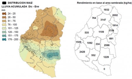 El primer mapa contiene las precipitaciones acumuladas entre diciembre y enero 2009 (meses que abarcan la floración y posterior llenado de los granos) y la distribución geográfica del cultivo en la provincia (producto de la clasificación de imágenes satelitales). El otro mapa contiene los rindes medios logrados en cada departamento.