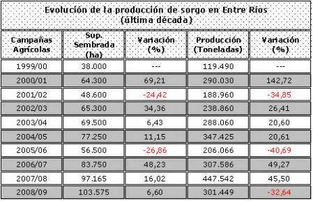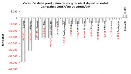 A excepción de lo acontecido en Diamante, donde la producción de sorgo superó al monto de la campaña pasada (hecho que se debe al sensible aumento del área que compensó los bajos rindes), en todo el resto de los departamentos se detectaron pérdidas con respecto al ciclo 2007/08.