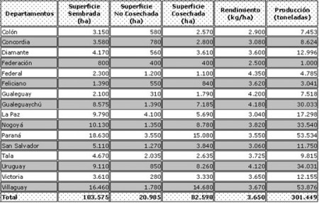 Los departamentos más afectados fueron La Paz, Villaguay y Paraná, los cuales en el ciclo anterior habían producido 201.739 toneladas, en la zafra que termina con mucho esfuerzo totalizaron 124.707 toneladas, es decir una reducción del 38,18%.