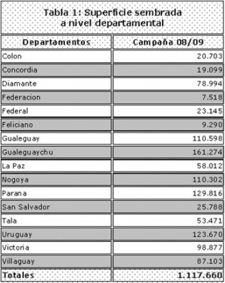 Los valores finales de superficie sembrada en el 2008/09, por departamento y total provincial se detallan en la Tabla 1.
