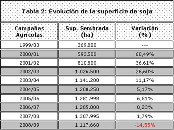 La tabla 2 muestra la evolución de la superficie cultivada con soja durante la última década, la cual ha sido elaborada con los datos estadísticos históricos de la Institución.