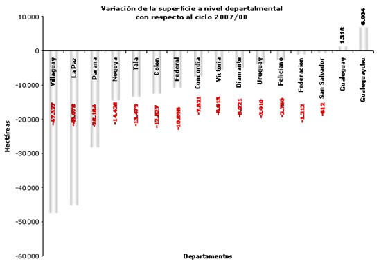 Del análisis del mismo surge que los departamentos Villaguay, La Paz, Paraná, Nogoyá, Tala, Colón y Federal, son los que acusaron la mayor disminución con respecto al número de hectáreas implantadas, representando el 43% del total provincial.