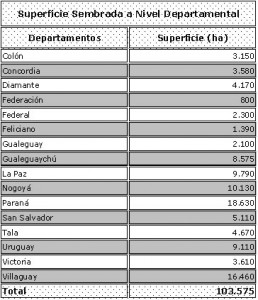 Los valores finales de superficie sembrada en el 2008/09, por departamento y total provincial se detallan en la siguiente Tabla.