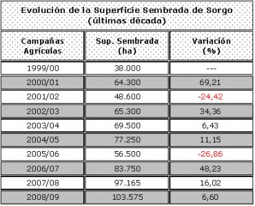 Hacia mediados del mes de agosto del 2008 la intención de siembra de sorgo por parte de los productores era superior a los de la campaña pasada ya que se planificaba un incremento en las hectáreas de sorgo forrajero y sin tanino, éste último con destino al sector avícola.