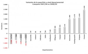 El siguiente gráfico presenta la variación en hectáreas en cada departamento comparada con la campaña 2007/08.