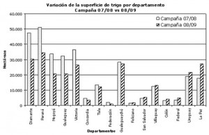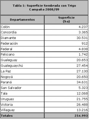 Un hecho importante ha sido la gran caída del área implantada con el cereal en los principales departamentos trigueros (Diamante, Paraná, Nogoyá, Gualeguay, Victoria y Gualeguaychú); los cuales en la Campaña 2007/08 abarcaban el 73,64% (230.000 ha), mientras que este año ocupan el 62,29% (160.407 ha).