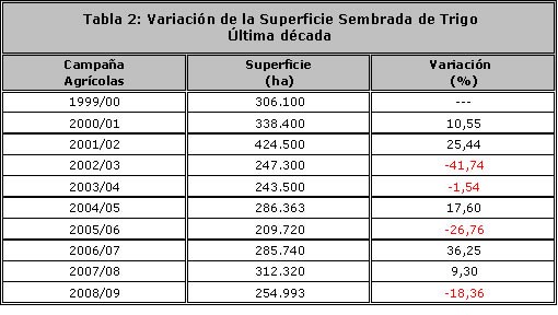 La tabla 2 muestra la evolución de la superficie triguera durante la última década, la cual ha sido elaborada con los datos estadísticos históricos de la Institución.