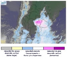 En la imagen satelital, puede apreciarse la ubicación de las celdas de tormenta. Mientras que el tempo mejora temporariamente desde el oeste en BA, la actividad se concentra en ER y el centro de SF. No se descarta en la zona que se observe tiempo severo, es decir, ráfagas y caída de granizo. Se aprecia también que ya las tormentas comienzan a formarse en Uruguay.