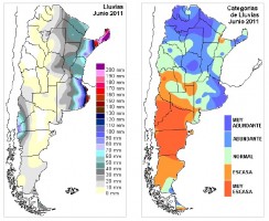 La comparación de los registros de junio con los valores estadísticos (1973-2010), define vastos sectores donde las lluvias pueden considerase abundantes para la época. Esta abundancia hay que analizarla con cuidado, dado que en el invierno en las zonas mediterráneas un registro de 15 o 20 milímetros basta para generar desvíos positivos de la precipitación respecto de sus valores medios mensuales. La anomalía positiva si tiene peso y fue muy oportuna, en el este de BA. A gran escala, el este de BA recibe en el trimestre frío entre 120 y 140 milímetros de lluvia. Esta sobreoferta de agua en el mes de junio, es muy efectiva a la hora de recuperar los perfiles de humedad. Gran parte de la Mesopotamia logró valores normales de precipitación para el mes de junio, con registros que se vuelven abundantes en la provincia de Misiones, donde predominaron marcas del orden de los 200 milímetros. Sobre el NEA y el NOA, también predominan anomalías positivas de la precipitación, sin embargo nuevamente aquí se aplica lo mismo que ya se explicó en referencia a otras zonas mediterráneas.