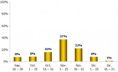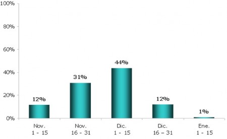 La emergencia del cultivo se concentró entre la segunda quincena de octubre y la primera quincena de noviembre, abarcando el 75% de lo encuestado, ver Gráfico 3.
