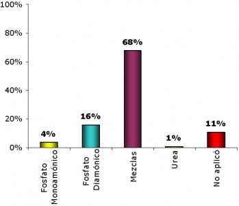 Dentro de los lotes fertilizados predominó el uso de mezclas con el 68%, seguido de diamónico 16% y en tercer lugar monoamónico con 4%.