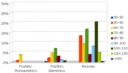 Se observa que en el caso de las mezclas las dosis son variables; predomina un 20% para la dosis de 100kg/ha a 110 kg/ha, el 16% el rango de dosis se ubica entre 70 kg/hay 80 kg/ha y el 13% entre 50 kg/ha y 60 kg/ha.