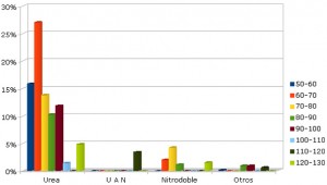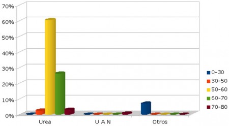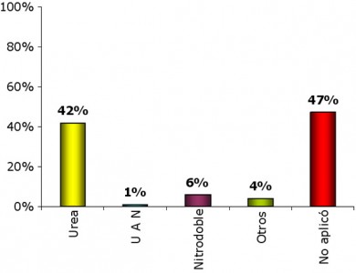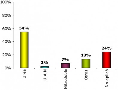Los fertilizantes utilizados fueron: Urea (54%), UAN (2%), Nitrodoble (7%) y Otros (13%).