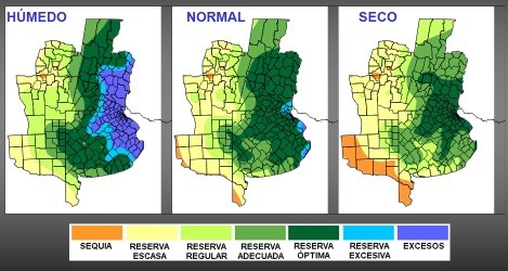 Actualmente las zonas más holgadas de humedad y que clasifican sus reservas como superiores a los valores normales, configuran una zona que comprende la mayor parte de la provincia de ER, centro norte de SF y sectores del norte central de BA. Desde el centro de Marcos Juárez y Unión hacia el noreste de CB, las situación puede considerase normal a ligeramente por encima de los valores normales para la época. Esto se repite en zonas del oeste de BA y el centro de LP. El sur de SF presenta niveles de humedad que disminuyen hacia el sudoeste ingresando al sudeste de CB, con almacenajes que clasifican muy por debajo de los normales. Con matices esta es también la situación del resto de sur de CB y las zonas agrícolas del centro y norte de esta provincia, aunque claramente el sudeste de CB es el más ajustado. Los partidos costeros del este y el sur de BA, incluyendo parte de Coronel Dorrego, presentan la situación más deficitaria de la provincia de BA. Si bien hemos mencionado en el Informe Climático Mensual que esta zona climáticamente tiene buenas perspectivas para recibir agua durante el invierno, las necesidades pluviales son perentorias, principalmente de cara a las siembras de ciclos largos en la zona de influencia de Tres Arroyos.