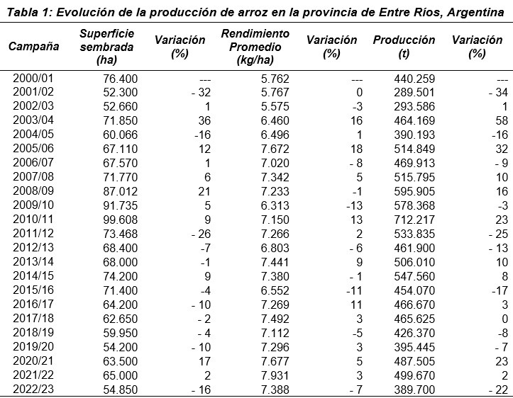 Los datos estadísticos sobre la evolución de la producción de arroz en Entre Ríos se presentan en la Tabla 1.