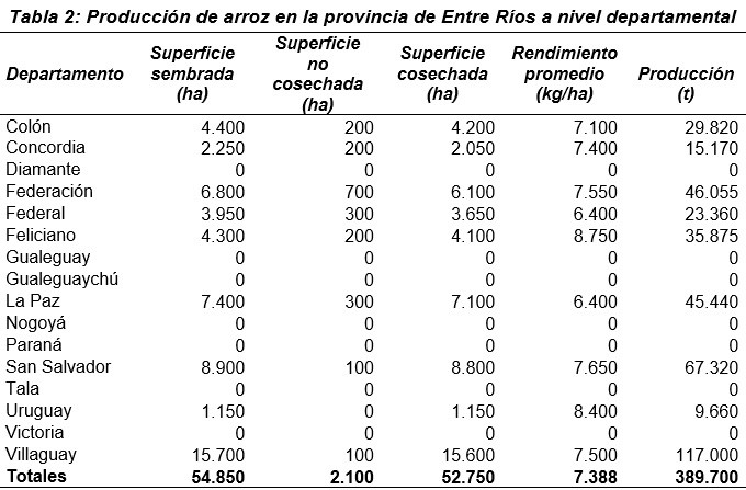 Los datos estadísticos sobre la superficie implantada con arroz a nivel departamental se presentan en la Tabla 2.