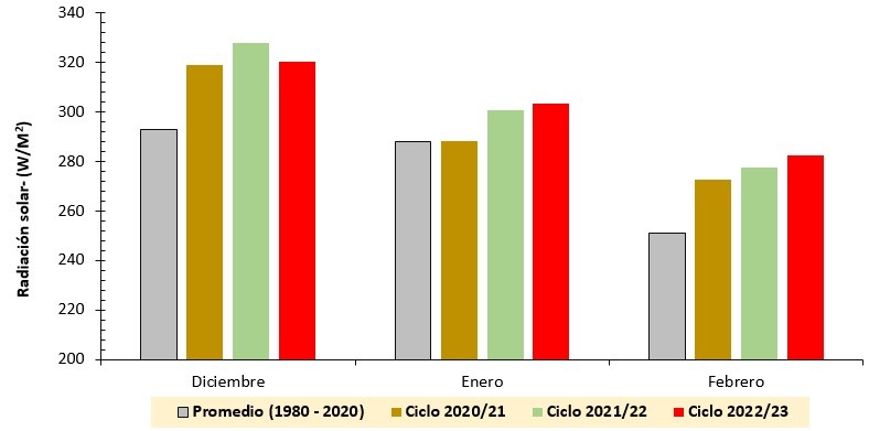 En las tres últimas campañas, la reducción de la precipitación en el trimestre diciembre – enero – febrero se correlacionó con un incremento en los valores de la radiación solar.