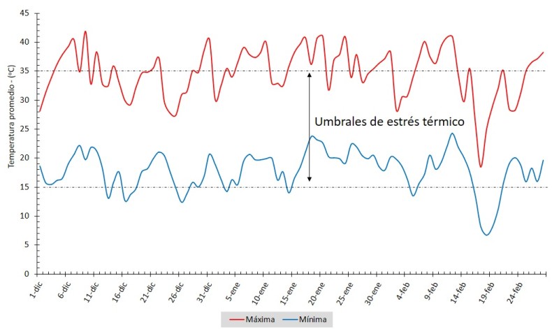 En cuanto a las temperaturas máximas, hubo un total de 46 días en los que los valores se ubicaron por encima de los 35 °C, lo cual generó un escenario de estrés por calor con los siguientes efectos: