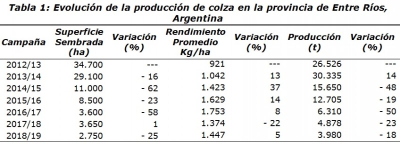 En la Tabla 1 se detalla la evolución de la producción de colza en la provincia de Entre Ríos.