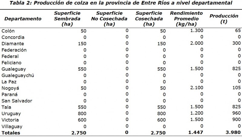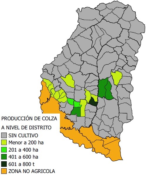 Los datos estadísticos sobre la producción de colza a nivel departamental se presentan en la Tabla 2.