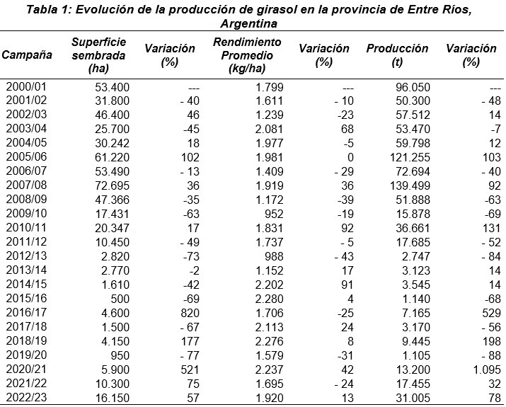 Los datos estadísticos sobre la evolución de área implantada y producción con girasol en Entre Ríos se presentan en la Tabla 1.