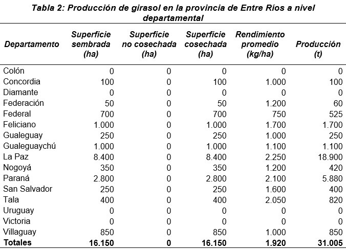 Los datos estadísticos sobre la superficie implantada con girasol a nivel departamental se presentan en la Tabla 2.
