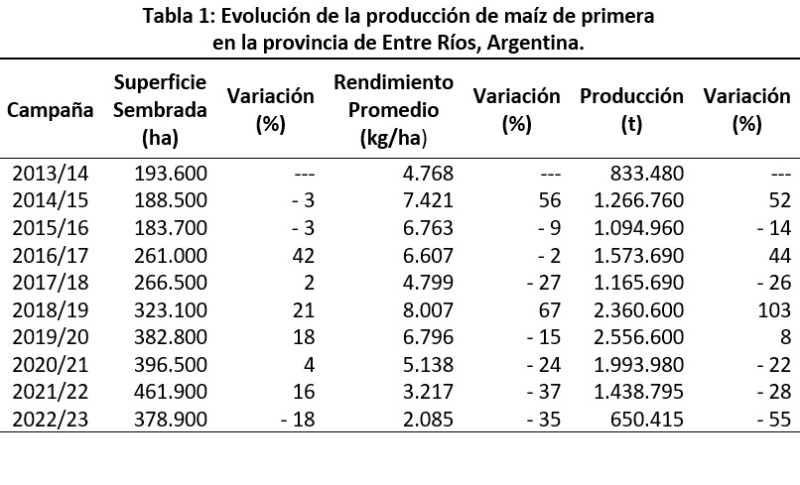 La Bolsa de Cereales de Entre Ríos da a conocer el informe correspondiente a la producción de maíz de primera en el ciclo 2022/23 en la provincia de Entre Ríos, Argentina.