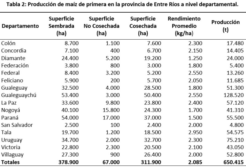 Los datos estadísticos sobre la producción de maíz de primera a nivel departamental se presentan en la Tabla 2.
