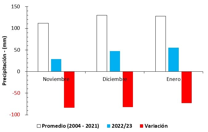 En la Figura 1 se muestra la precipitación promedio acumulada (2004-2021) entre los meses de noviembre a enero, los registros correspondientes al ciclo 2022/23 y su variación.