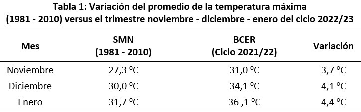 El promedio de la temperatura máxima para este trimestre (datos publicados por el Servicio Meteorológico Nacional en el periodo 1981 – 2010), se ubica en 29,7 oC. Mientras que, en el ciclo 2022/23 el valor ascendió a 33,9 oC (dato obtenido de la red de centrales meteorológicas de la BCER).