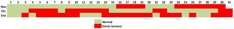 Desde el 01/Nov/2022 al 31/Ene/2023 se contabilizaron un total de 43 días caracterizados por estrés térmico, los cuales se presentan en la Figura 2.