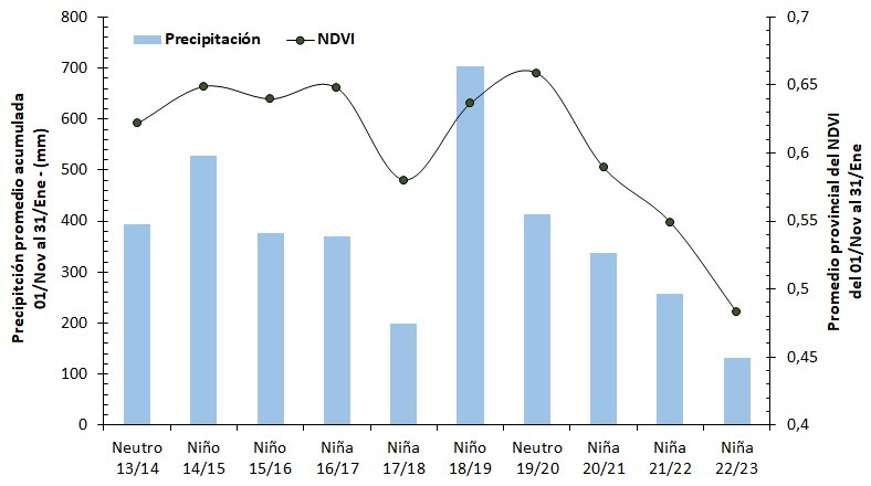 En la Figura 3 se presenta el promedio de la precipitación acumulada y el NDVI para la provincia de Entre Ríos en el trimestre noviembre – diciembre – enero en los últimos 10 años.