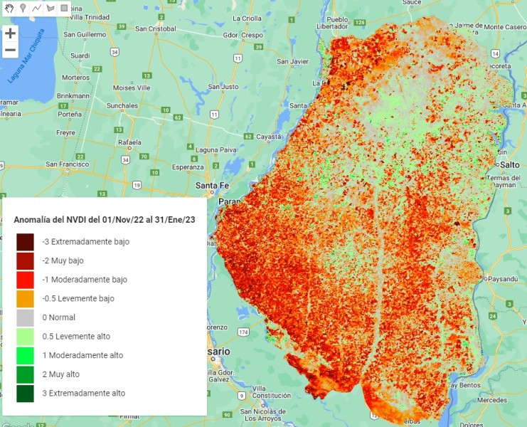 Tal como puede observarse, el promedio del NDVI en el trimestre noviembre – diciembre – enero es el más bajo de la última década y da una idea del impacto de la sequía, ya que el promedio para este periodo se suele posicionar alrededor de 0,6.