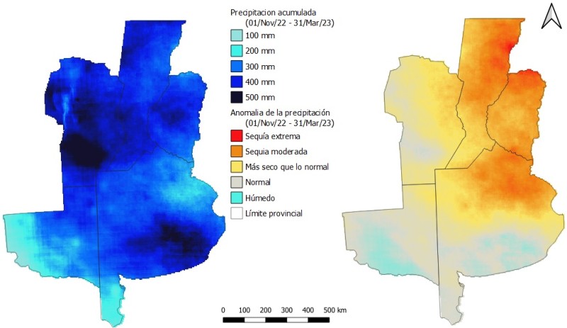 El promedio de la precipitación en la región pampeana entre los meses de noviembre a marzo se ubica en 480 mm aproximadamente. Es importante destacar que, entre el 01/Nov/22 al 31/Mar/23 la lluvia acumulada registró una caída del 31 %, lo cual equivale a una merma de 150 mm.