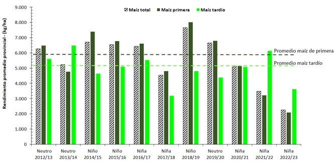 En la Figura 2 se muestra el rendimiento promedio provincial del maíz, maíz de primera y tardío/de segunda.