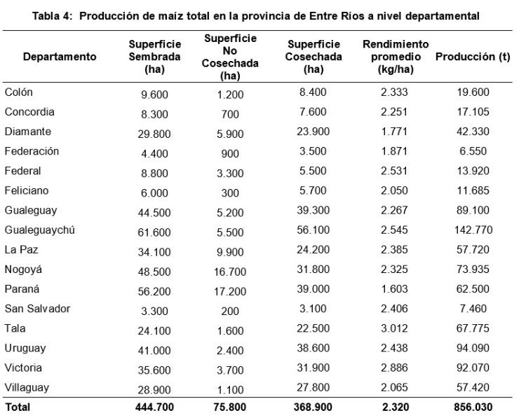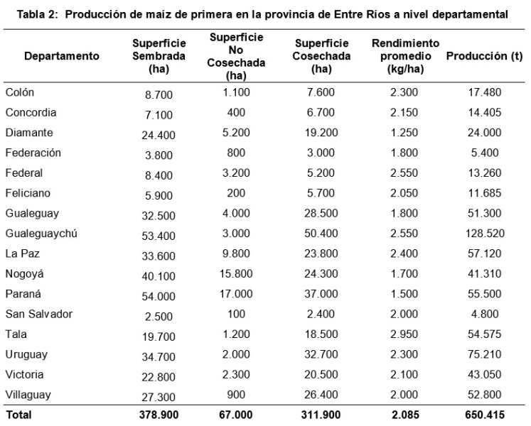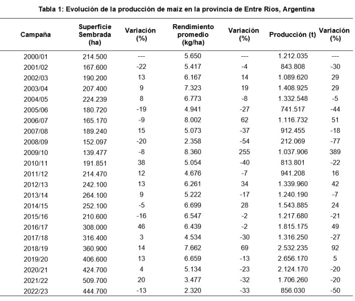 Los datos estadísticos sobre la evolución del área implantada con maíz en Entre Ríos se presentan en la Tabla 1.