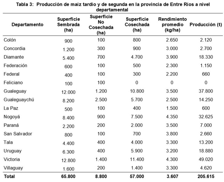 Los datos estadísticos de las principales variables que definen la producción de maíz tardío y de segunda a nivel departamental se presentan en la Tabla 3.