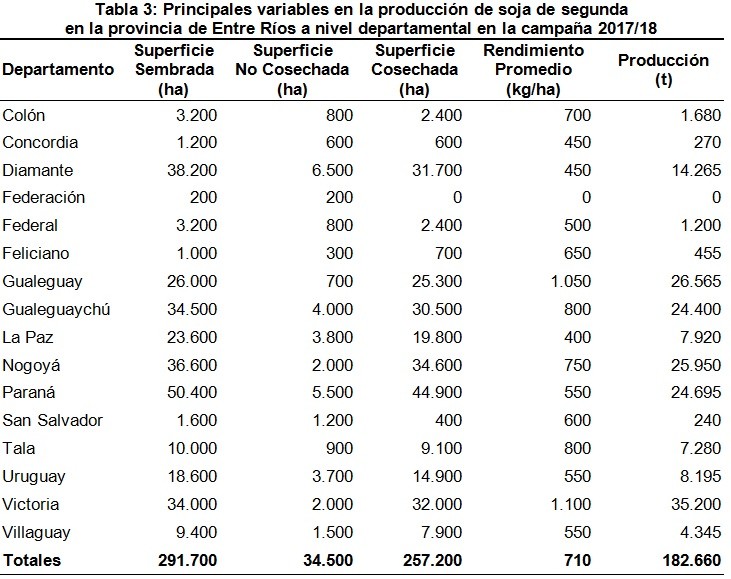 En la Tabla 3 se detallan las principales variables en la producción de soja de segunda a nivel departamental.