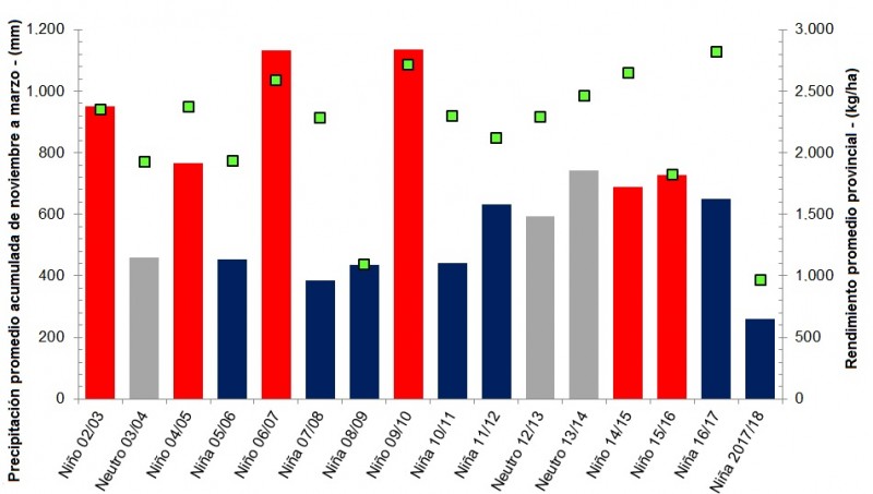La campaña de soja 2017/18 estuvo bajo la influencia de un evento “La Niña”. La “Niña” es una disminución de la temperatura en el Pacífico Ecuatorial que genera, en la mayoría de los años en que aparece, una reducción de la precipitación entre los meses de noviembre a marzo en un área que abarca desde el centro Sur de Brasil al Sur de la provincia de Buenos Aires.