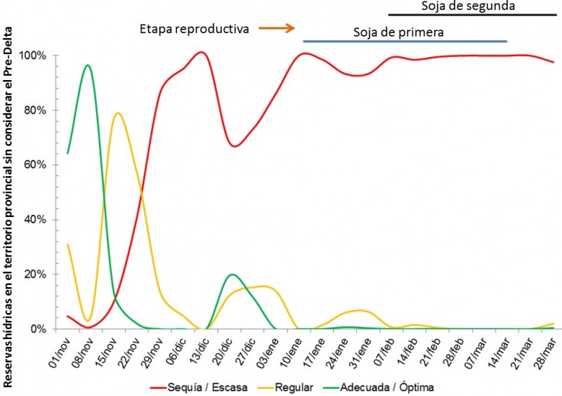Para el caso de la soja de segunda, la fase vegetativa abarca desde diciembre a mediados de febrero. Durante este periodo el 90 % tuvo una situación de sequía a reservas escasas.