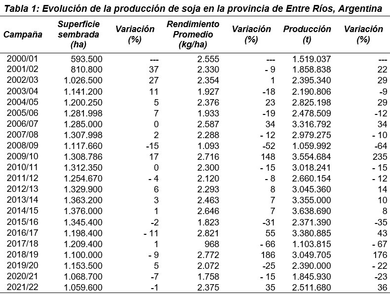 Los datos estadísticos sobre la evolución del área implantada con soja en Entre Ríos se presentan en la Tabla 1.