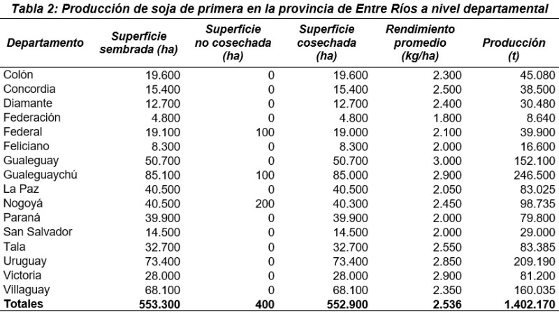 Los datos estadísticos sobre la superficie implantada con soja de primera a nivel departamental se presentan en la Tabla 2.