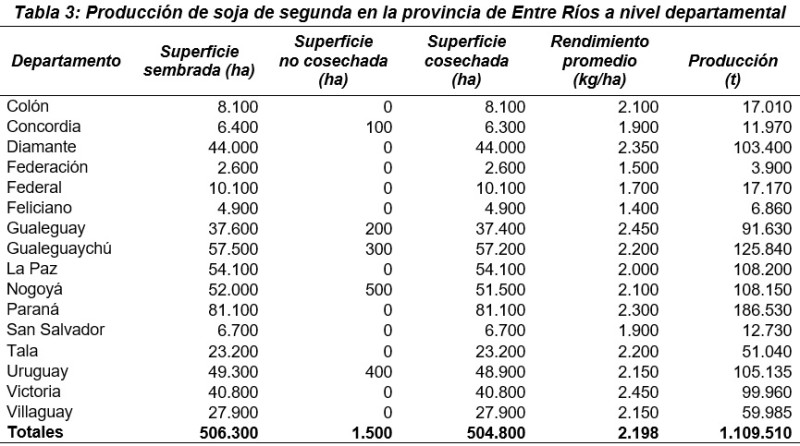 Los datos estadísticos sobre la superficie implantada con soja de segunda a nivel departamental se presentan en la Tabla 3.