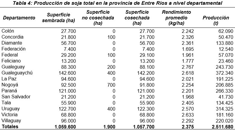 Los datos estadísticos sobre la superficie implantada con soja total a nivel departamental se presentan en la Tabla 4.