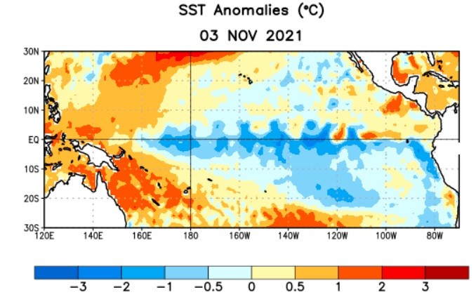 La Figura 1 muestra la situación del Pacífico Ecuatorial a inicios de noviembre, donde se observa un descenso de aproximadamente 1 oC en relación a la temperatura promedio superficial.