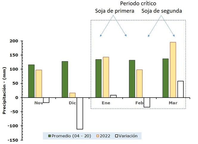 Es importante destacar que el periodo crítico de la soja se ubica dentro del trimestre enero – febrero – marzo. La precipitación promedio acumulada para el trimestre es de 404 mm, en el ciclo 2021/22 el valor se ubicó en 436 mm, lo cual aportó un extra de 8 % (32 mm).
