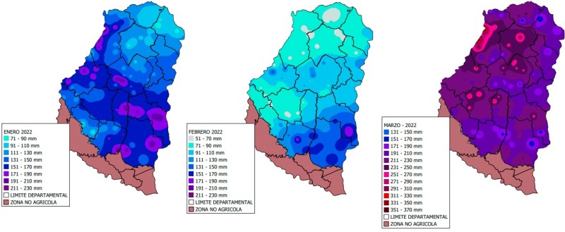 La Figura 3 muestra la distribución de la precipitación acumulada en los meses de enero, febrero y marzo del 2022 en la provincia de Entre Ríos.