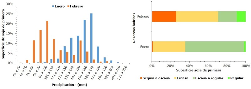 En la Figura 5 se muestra el histograma de la precipitación y promedio de las reservas hídricas en los lotes de soja de primera en la provincia de Entre Ríos en los meses de enero y febrero del 2022.
