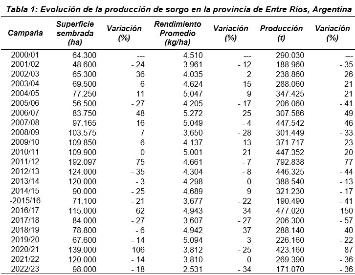 Los datos estadísticos sobre la evolución del área implantada con sorgo en Entre Ríos se presentan en la Tabla 1.
